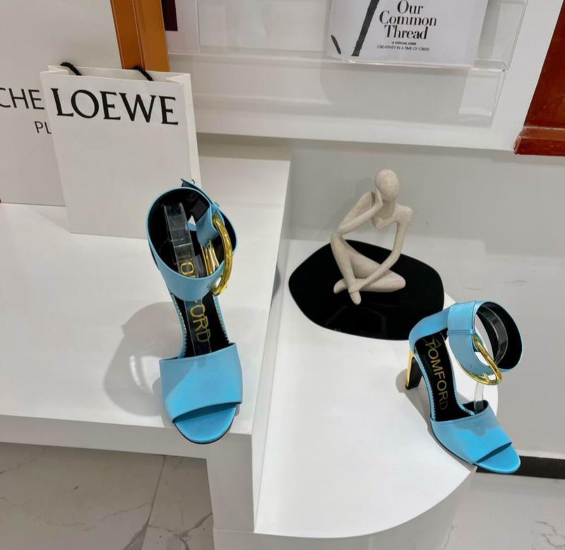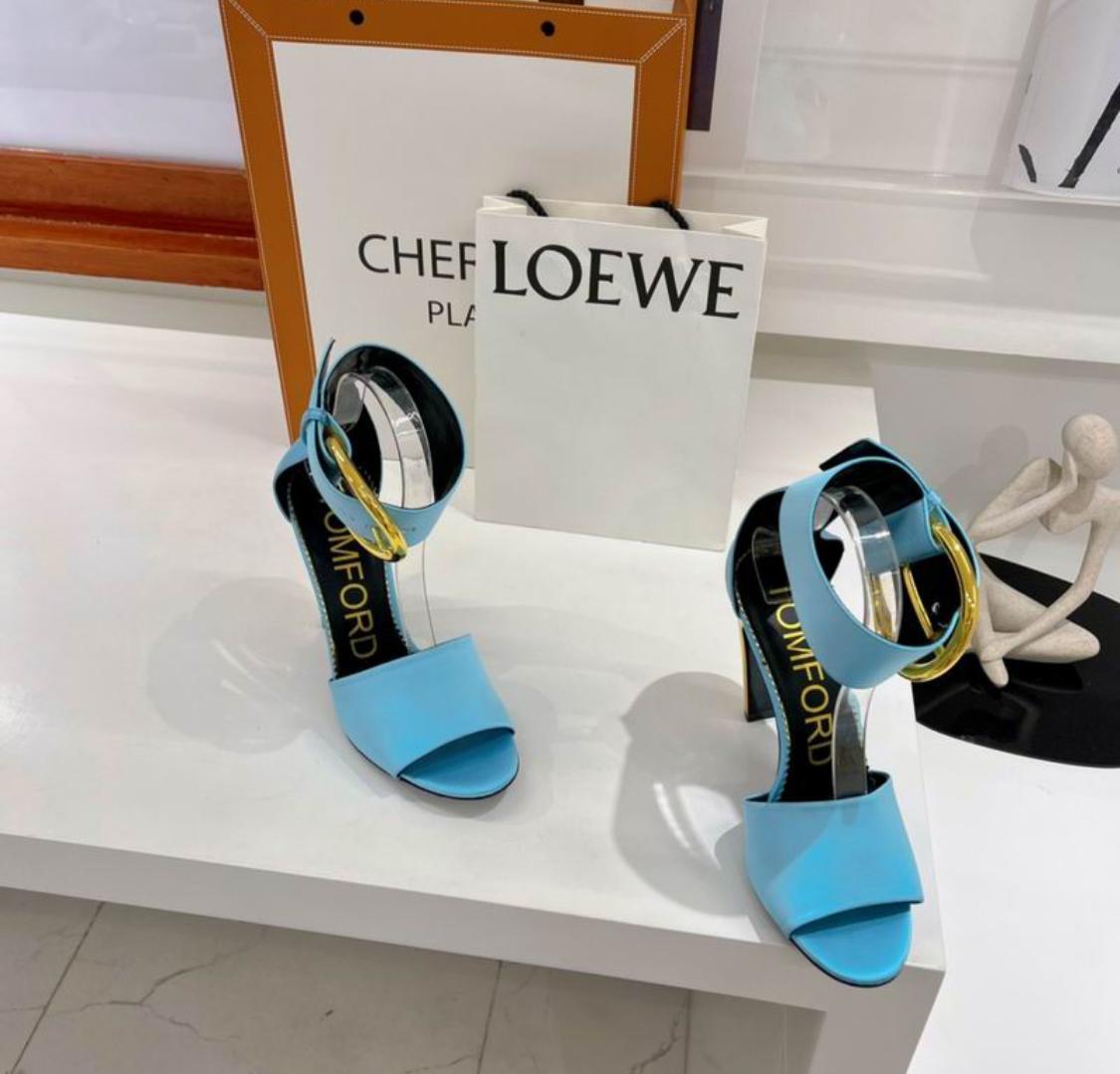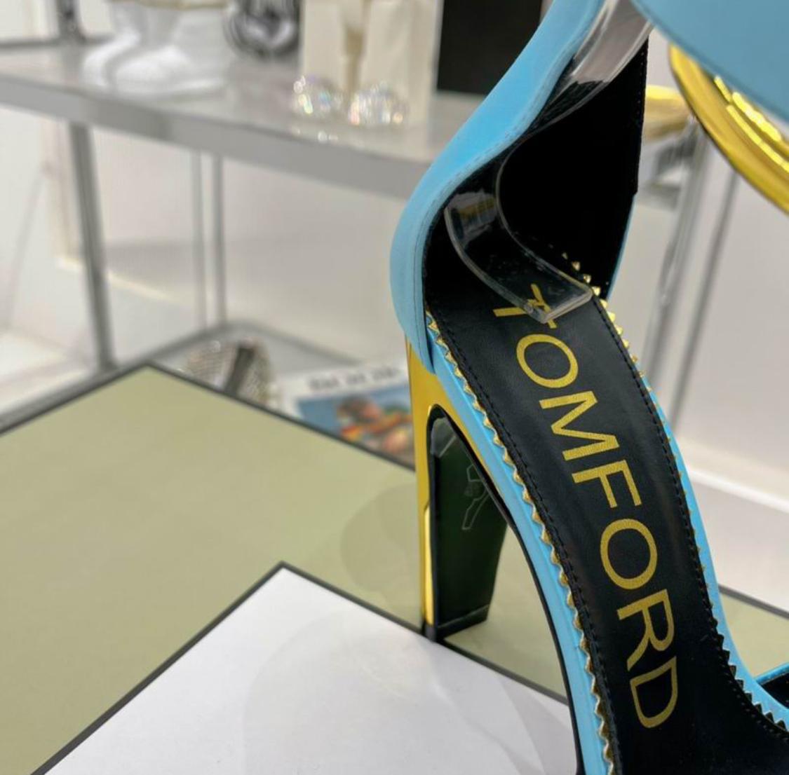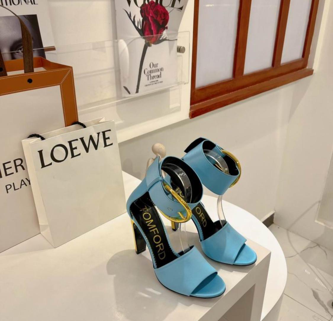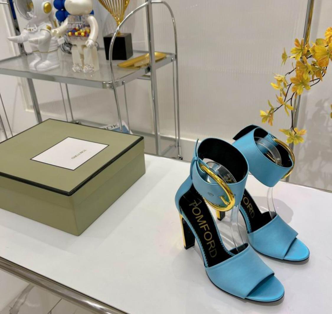 Tomford Oversized Buckle Satin Ankle-Strap Sandals in Blue